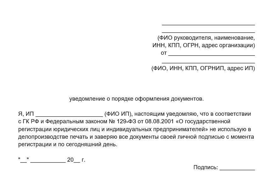 Некоторые контрагенты настаивают на том, чтобы печать была, т.к. в случае, если дойдет до суда, будет проще доказать, что подпись на документе не подделана. Если же печати нет, у вас могут попросить письмо о том, что она не используется. Его можно составить в свободной форме, например: «Уведомляю, что я, ИП Сидоров Константин Петрович, не использую печать в своей деятельности, так как соответствующая обязанность законом не установлена. Все документы, имеющие отношение к моей предпринимательской деятельности, с момента регистрации заверяю личной подписью».