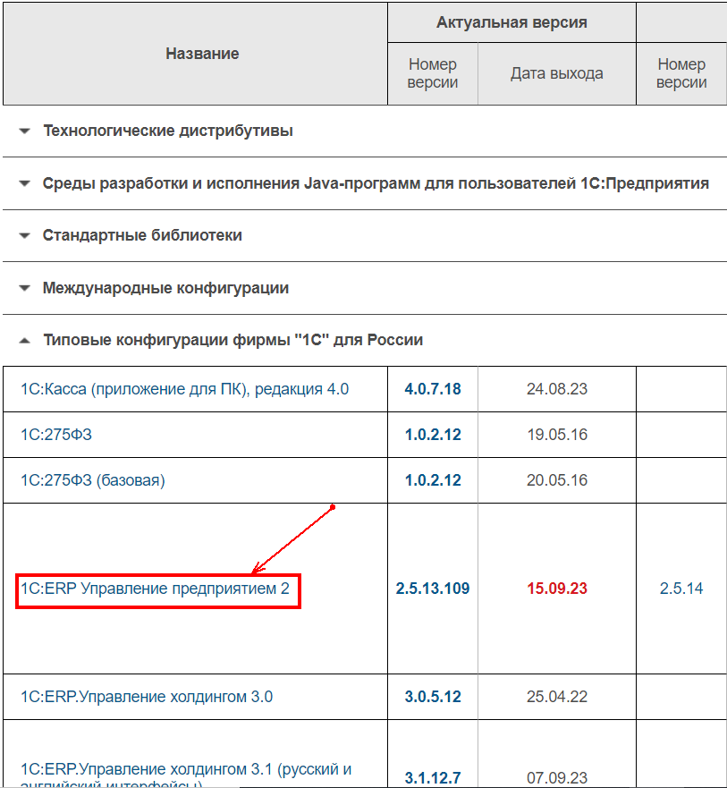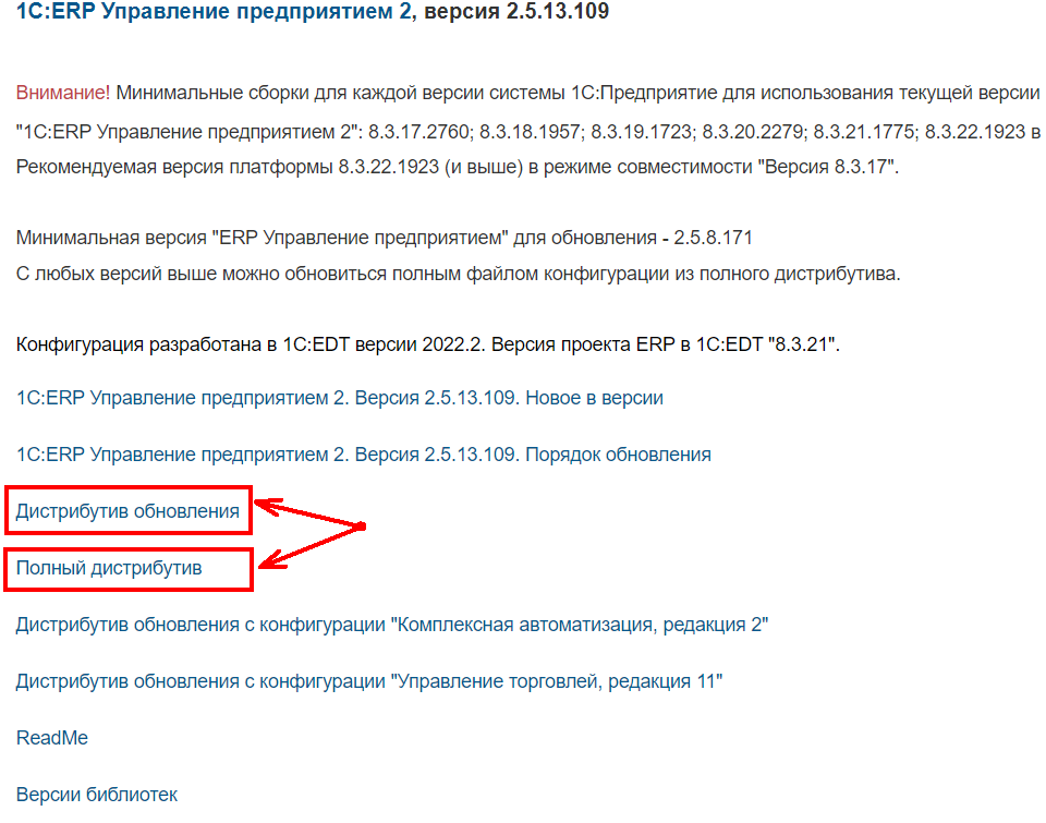 После нажатия на нужный номер версии появится возможность скачать файлы поддержки как в формате дистрибутивов самих обновлений, так и полного дистрибутива конфигурации*.