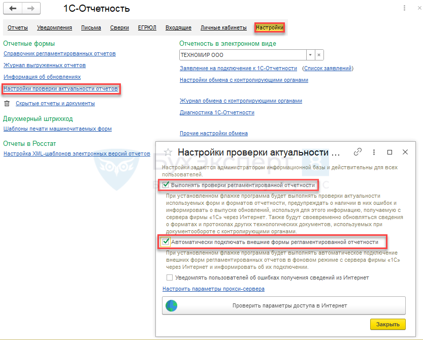 Из рабочего места 1С-Отчетность пройдите в Настройки – Отчетные формы — Настройки проверки актуальности отчетов.