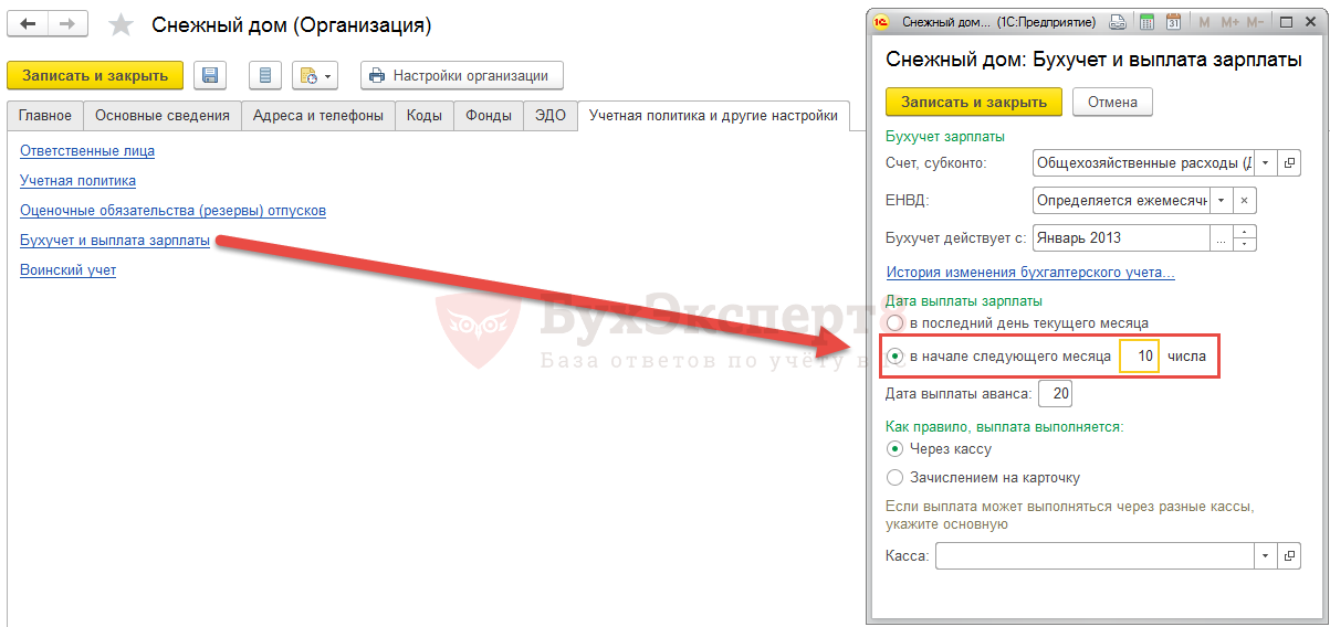 Для корректного расчета компенсации необходимо, чтобы в настройках организации (справочник Организации – вкладка Учетная политика и другие настройки – ссылка Бухучет и выплата зарплаты ) была указана корректная дата выплаты зарплаты. Именно на основании этой даты будет определяться, на сколько дней просрочена выплата.