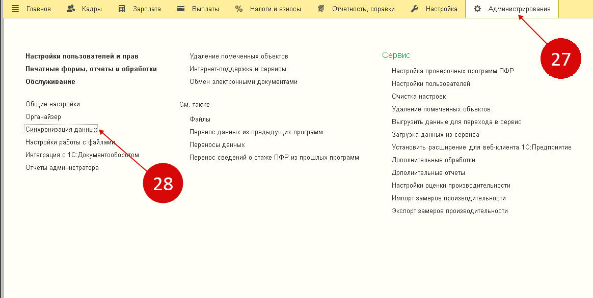 Вы успешно настроили синхронизацию между базами и начали обмен данными. Изменять настройки обмена и контролировать процесс синхронизации вы можете в окне «Синхронизация данных». Зайти в него можно через раздел «Администрирование» (27) кликнув на ссылку «Синхронизация данных» (28).