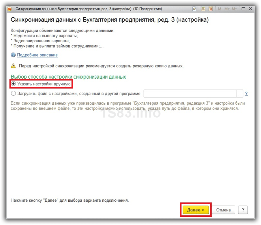 Шаг 3. Продолжите настройку синхронизации в 1С ЗУП 3.1