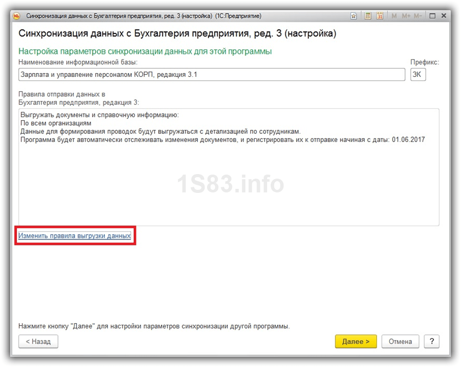 Следующим шагом будет настройка правил выгрузки зарплаты и других данных. Вы можете оставить здесь все по умолчанию. При необходимости есть возможность изменения правил обмена между ЗУП и БП.