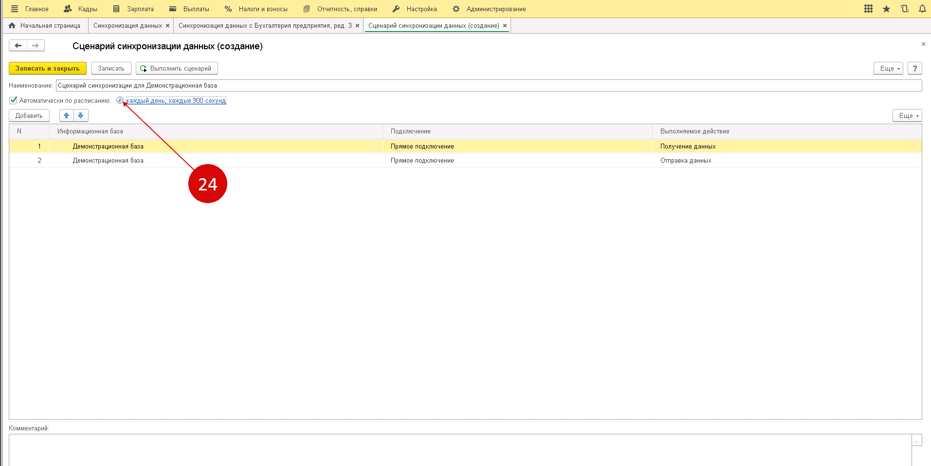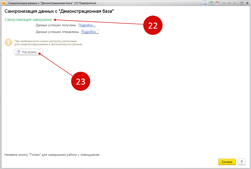 После завершения обмена данными откроется окно с сообщением о завершении синхронизации (22). В этом окне вы можете настроить так называемое «расписание обмена», т.е. временные правила, по которым автоматически будет проходить обмен данными между двумя базами. Для настройки этих правил нажмите кнопку «Настроить» (23). Откроется сценарий синхронизации данных.