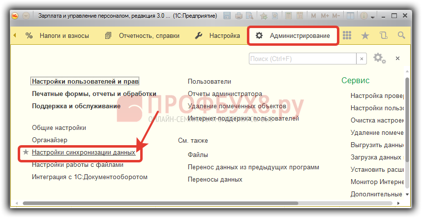Перейдем в раздел Администрирование – Настройки синхронизации данных: