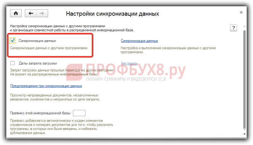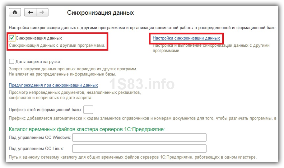 Установите флаг на пункте «Синхронизация данных и перейдите по гиперссылке справа. Данный флаг обязательно должен быть установлен в двух информационных базах.