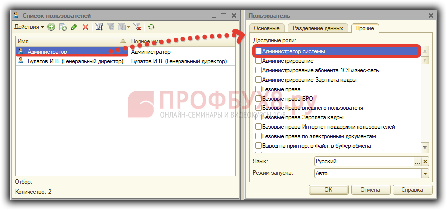 Открыть карточку данного пользователя, перейди на вкладку «Прочие» и установить флажок «Администратор системы»: