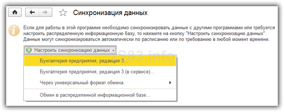 В появившемся окне выберите из меню «Настройка синхронизации данных» выберите пункт «Бухгалтерия предприятия, редакция 3…».