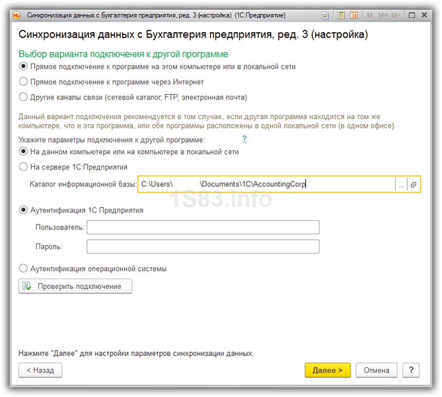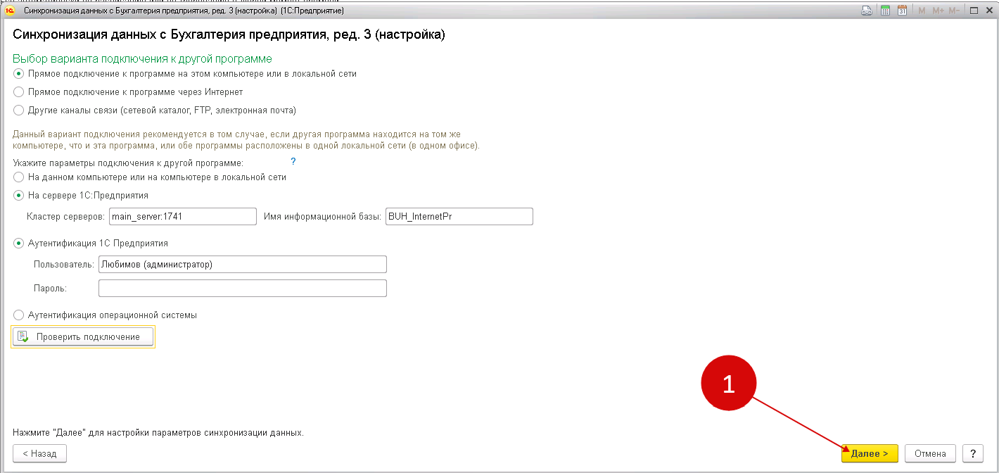 В первом шаге мы остановились на проверке подключения. Если все прошло успешно, нажмите кнопку «Далее» (1). Откроется окно для дальнейшей настройки синхронизации.