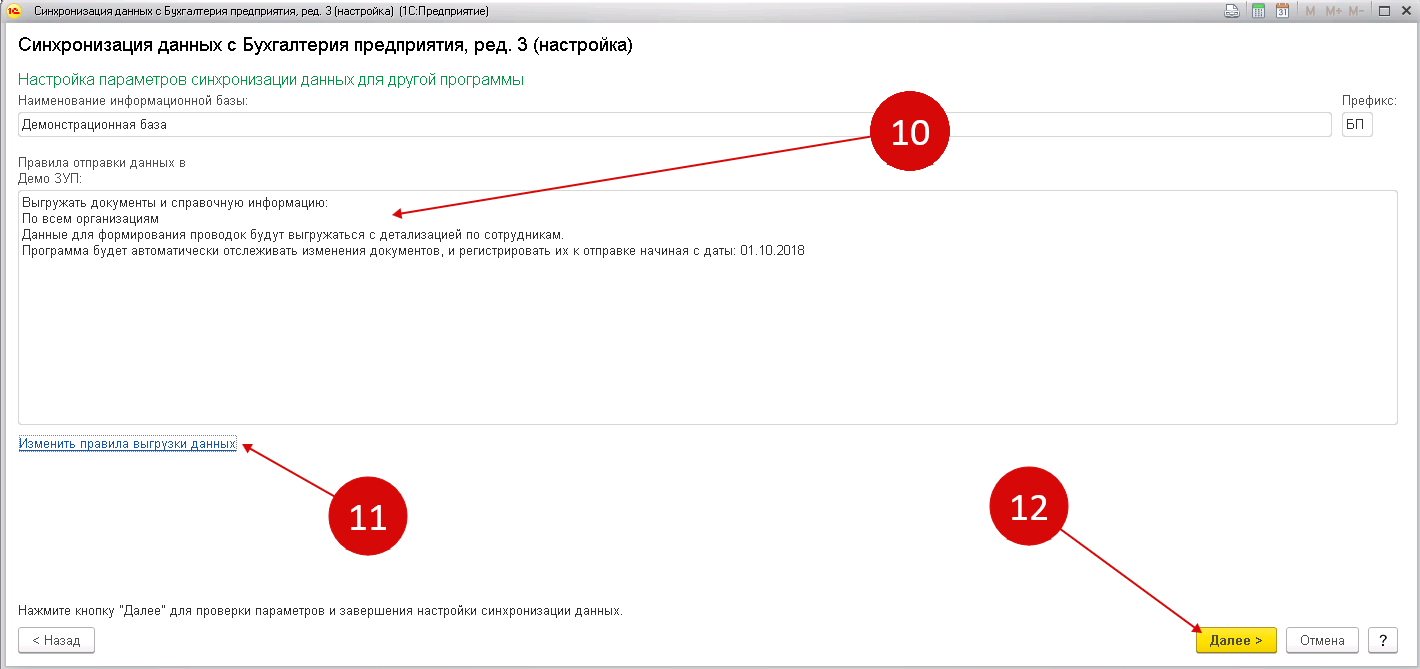 В этом окне вы видите правила (10) по выгрузке данных из 1С Бухгалтерия в 1С ЗУП. При необходимости вы можете их изменить по аналогии с предыдущей настройкой, кликнув на ссылку «Изменить» (11). Для продолжения нажмите кнопку «Далее» (12). Откроется окно с обобщающей информацией по настройке синхронизации.