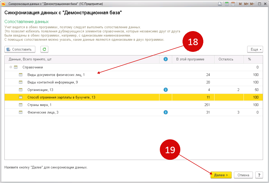 В новом окне видны справочники, по которым есть несинхронизированные данные (18). Поскольку вы с указанной в настройке даты будете синхронизировать информацию двух разных информационных баз – 1С ЗУП и 1С Бухгалтерия, необходимо чтобы определенные справочники в обеих базах имели одинаковые значения. К таким справочникам относятся, например, «Физические лица», «Организации», «Способы отражения зарплаты в учете». В этом окне вы видите справочники (18), по которым данные не совпадают. Программа автоматически создаст недостающие элементы справочников в обеих базах. Для этого нажмите кнопку «Далее» (19). Откроется следующее окно для синхронизации данных.