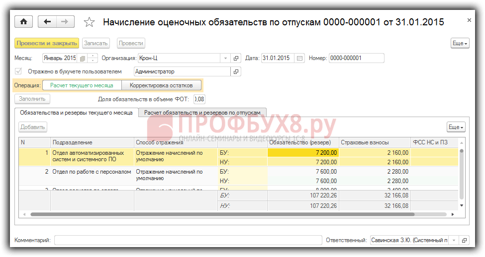 Аналогично работа с документом «Начисление оценочных обязательств по отпускам»:
