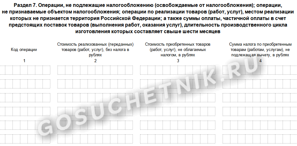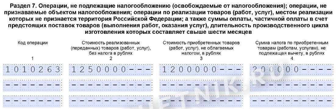 Раздел 7 налоговой декларации по НДС — это блок, в котором описываются операции, не подлежащие налогообложению. Заполняют его не все.