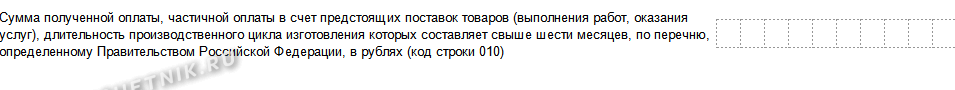 Обязательно заполнение для налогоплательщиков, которые получили оплату или авансирование (частичную оплату) за будущие поставки товаров, работ и услуг, производящиеся или выполняющиеся дольше шести месяцев. Такие сведения отражаются в строке 010 блока № 7.