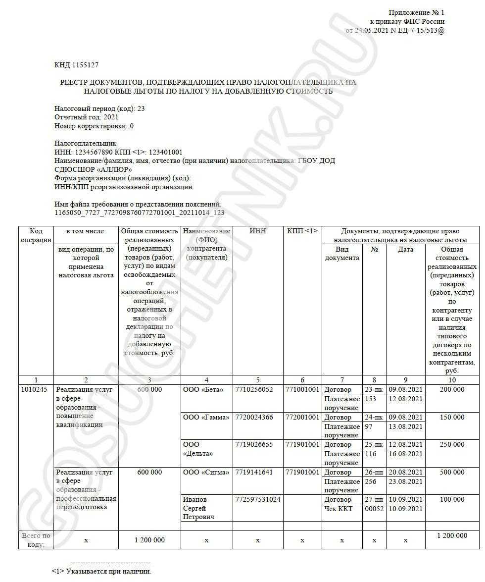 Коды указывают в первой графе блока. По кодировке определяется тип необлагаемой операции. Все коды операций указывайте по Приложению № 1 Приказа № ММВ-7-3/558@. К примеру, код операции в разделе 7 декларации по НДС для реализации земельного участка — 1010806.