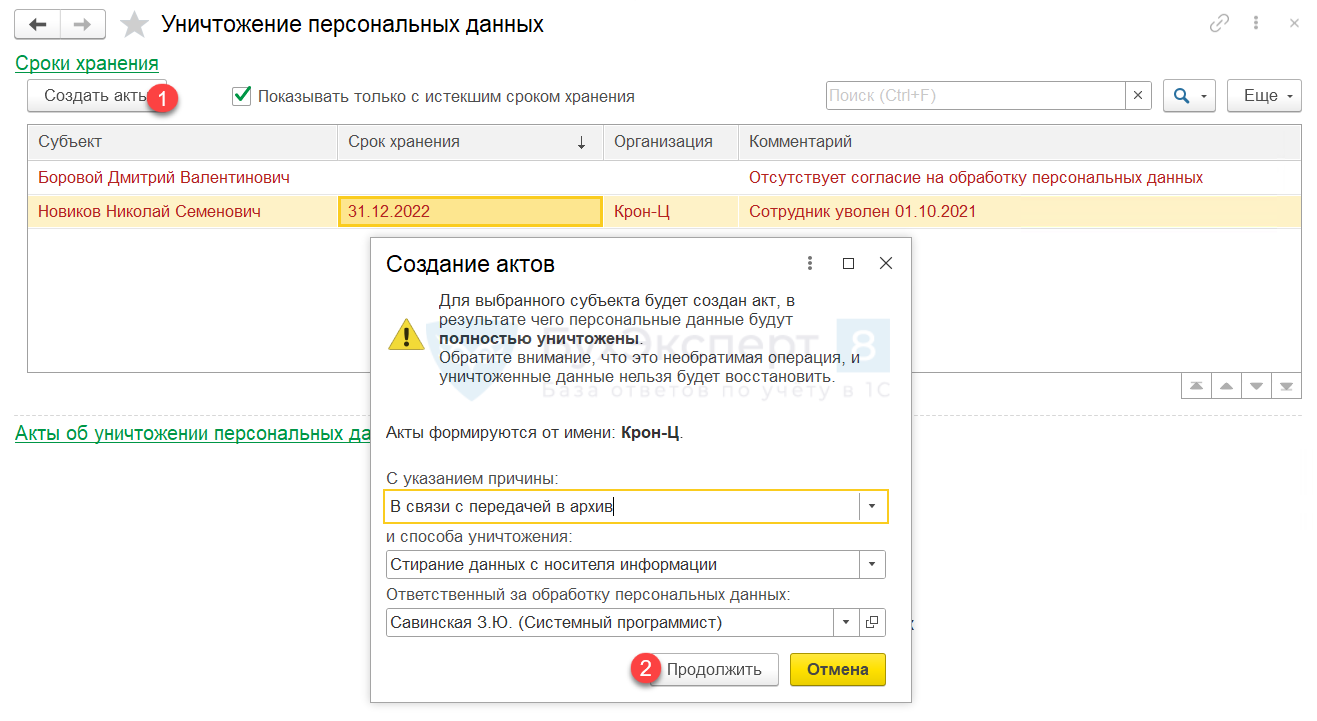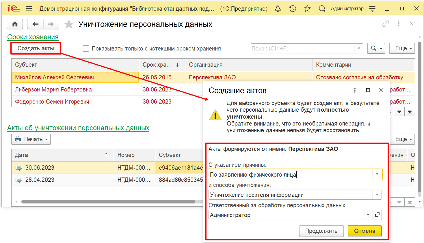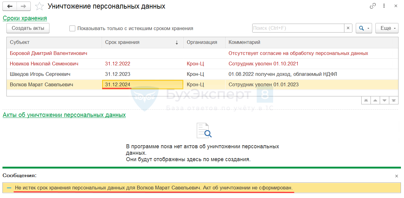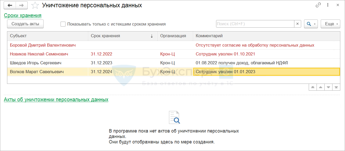 В списке можно отфильтровать документы согласий на обработку персональных данных с истекшим сроком, а также составить «Акт об уничтожении персональных данных». При проведении акта произойдет полное уничтожение персональных данных выбранного субъекта в справочнике «Физические лица», а также в следующих связанных с ним объектах: