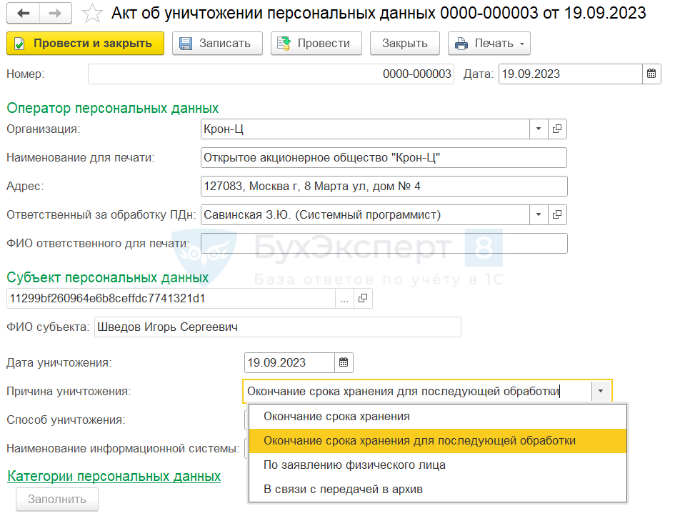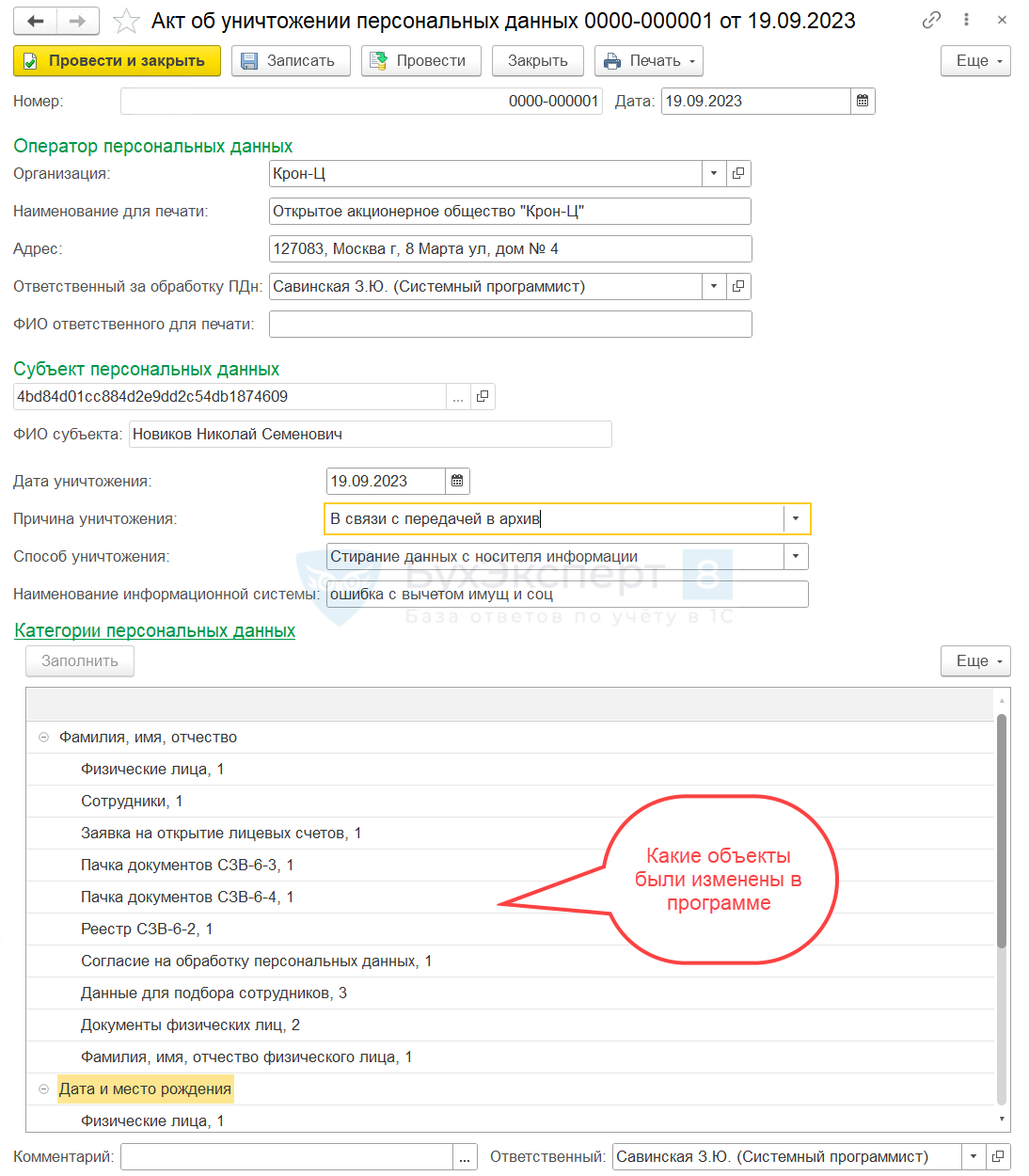 Акт об уничтожении персональных данных – это документ, который фиксирует результат удаления персональных данных для каждого из обработанных сотрудников. В группе реквизитов Категории персональных данных отображается, какие персональные данные в каких объектах информационной базы были изменены.
