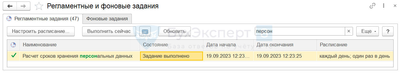 Расчет даты окончания срока производится регламентным заданием Расчет сроков хранения персональных данных (Администрирование – Обслуживание – Регламентные операции – Регламентные и фоновые задания) по заданному расписанию.