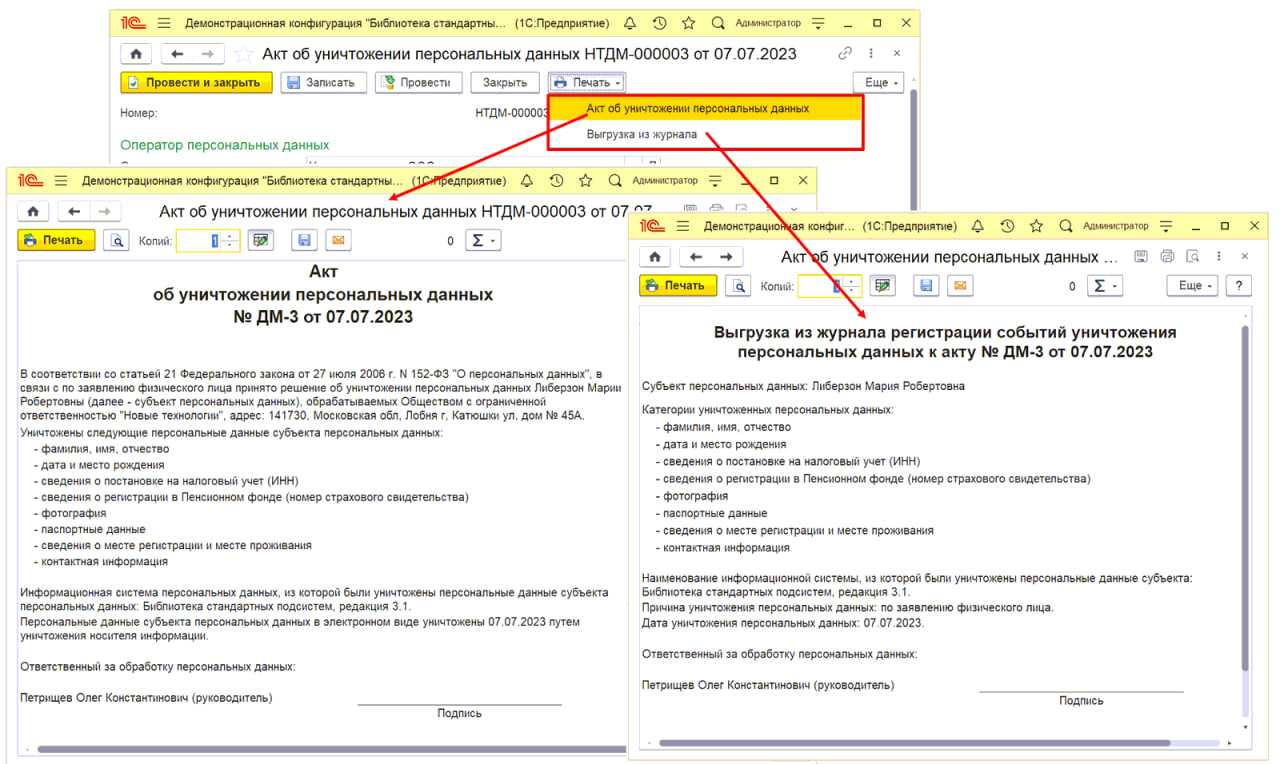Из документа можно вывести печатные формы «Акта об уничтожении персональных данных» и «Выгрузки из журнала» – по закону они подлежат хранению в течение 3 лет с момента уничтожения персональных данных.