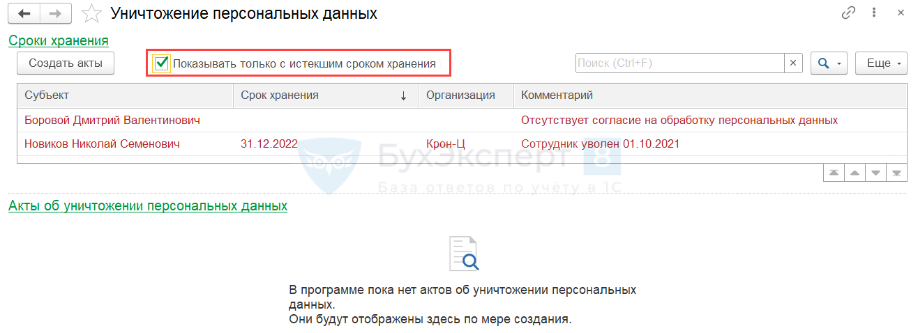 По флажку Показать только с истекшим сроком хранения будут отображены уволенные сотрудники, для которых наступила дата окончания хранения персональных данных.