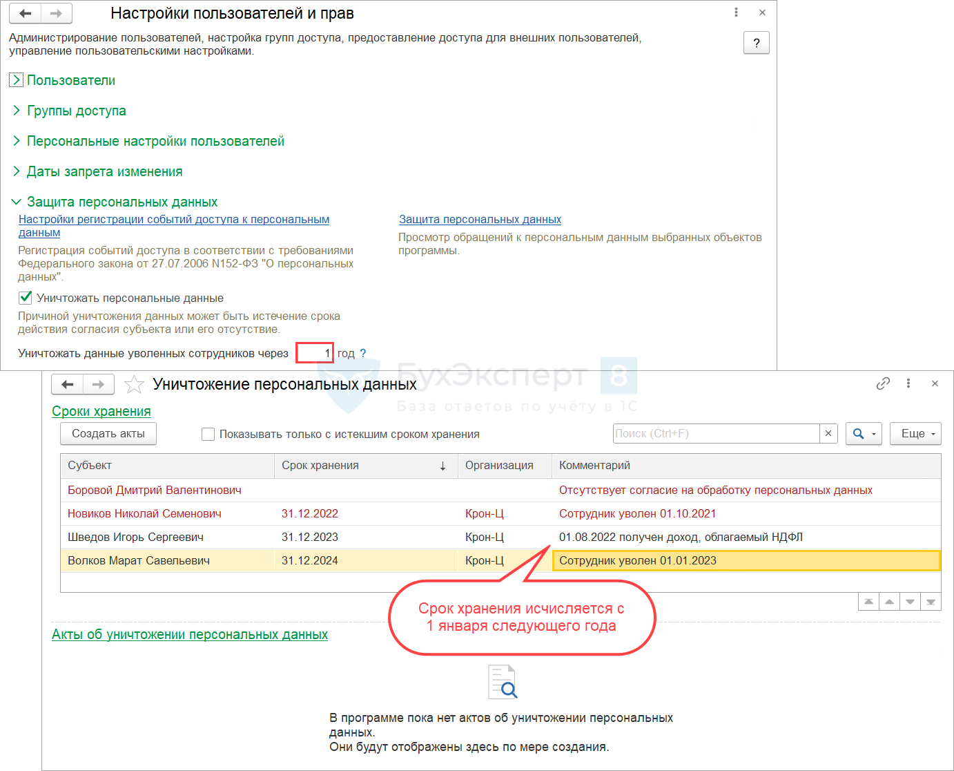 Для включения функциональности в настройках программы должна быть включена опция «Уничтожать персональные данные» (в разделе «Настройки пользователей и прав» – «Защита персональных данных»).