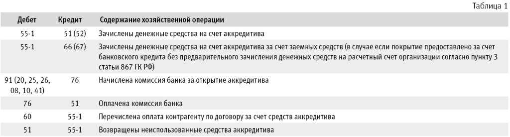 В таблице 1 представлены проводки по отражению операций по аккредитиву на счетах бухгалтерского учета (БУ).