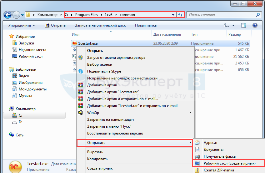 - правой кнопкой по файлу 1cestart.exe вызовите контекстное меню и выберите Отправить — Рабочий стол (создать ярлык) .