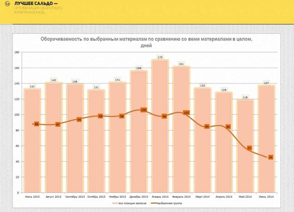Известно, что ускорение оборачиваемости запасов приводит к росту доходности активов. Данный анализ товарных запасов и пути ускорения оборачиваемости позволяют выявить те группы ТМЦ, расход которых увеличился за последнее время. Одновременно показываются позиции с замедленной скоростью реализации. Подход применим не только к продукции, приобретенной организацией для реализации. Методика используется и при анализе оборота материально-сырьевых ценностей.