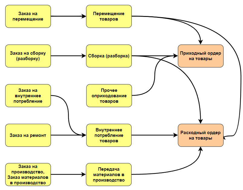 Оформление складских операций сопряжено с выполнением операций внутреннего товародвижения. С помощью документов внутреннего товародвижения можно списывать ТМЦ на внутренние нужды или перемещать между складами организации. Рассмотрим процесс внутреннего товародвижения на схеме. Желтым отмечены документы, оформляемые как при безордерной (однофазной), так и при ордерной (двухфазной) схеме, оранжевым – документы ордерной схемы.