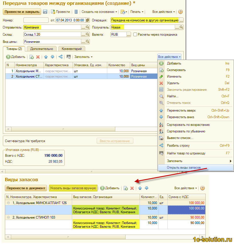 Поможем системе выбрать нужного комитента. Включаем контроль остатков организаций. Создаем новый документ перемещения, в табличной части документа «Товары» c помощью меню «Все действия → Открыть виды запасов» открываем обработку «Виды запасов».