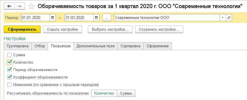 Вариант расчета показателей устанавливается в настройках отчета (кнопка Показать настройки). На закладке Показатели тумблер Рассчитывать оборачиваемость по показателю может быть установлен в одно из положений: Количество или Сумма (рис. 2).