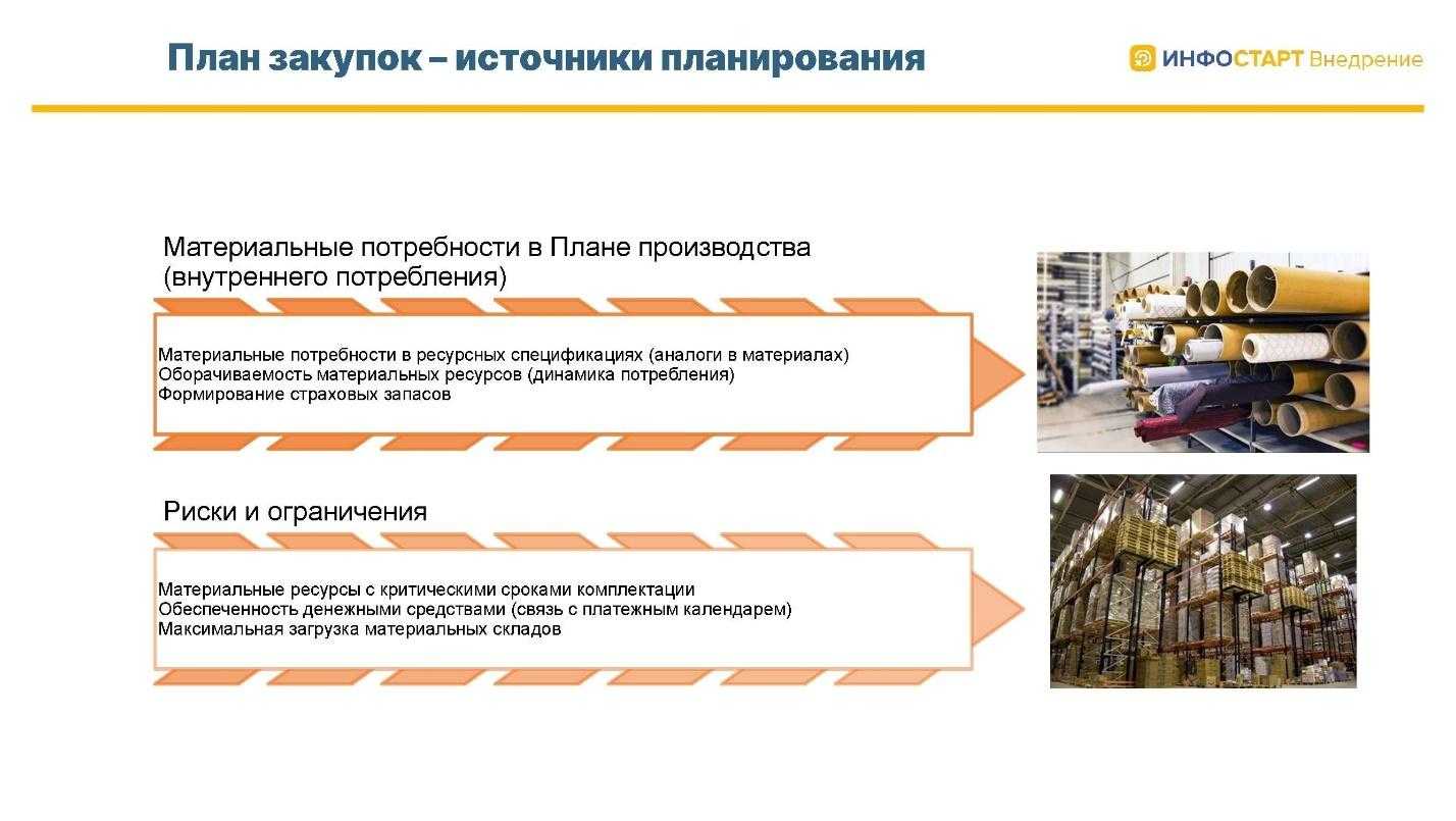 Сформировали план производства, понимаем, сколько нам нужно выпустить – значит, можем определить материальные потребности и сформировать на недостающее количество сырья и материалов план закупок и заказы поставщикам