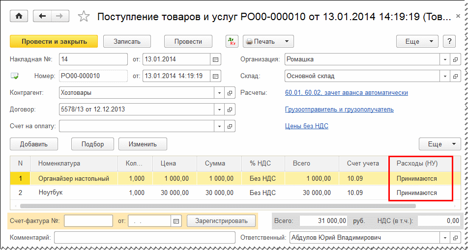 13 января 2014 года ООО «Ромашка» оплатило и приобрело у ООО «Хозтовары № 31» настольный органайзер стоимостью 1 000 руб. и ноутбук стоимостью 30 000 руб.