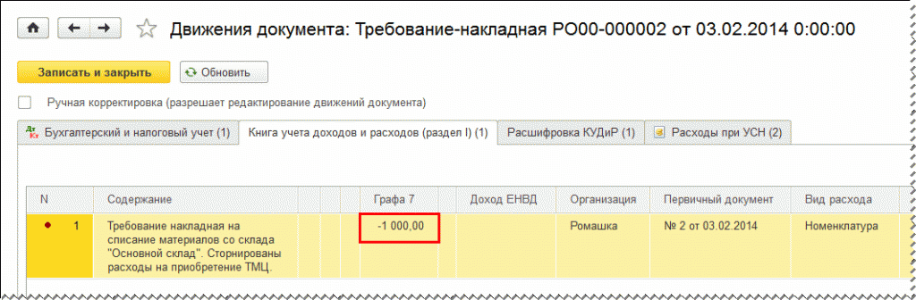 После проведения документа Требование-накладная наряду с бухгалтерскими проводками и движениями регистра Расходы при УСН вводится сторнировочная запись (рис. 9) на 1000 руб. в регистр Книга учета доходов и расходов (раздел I).