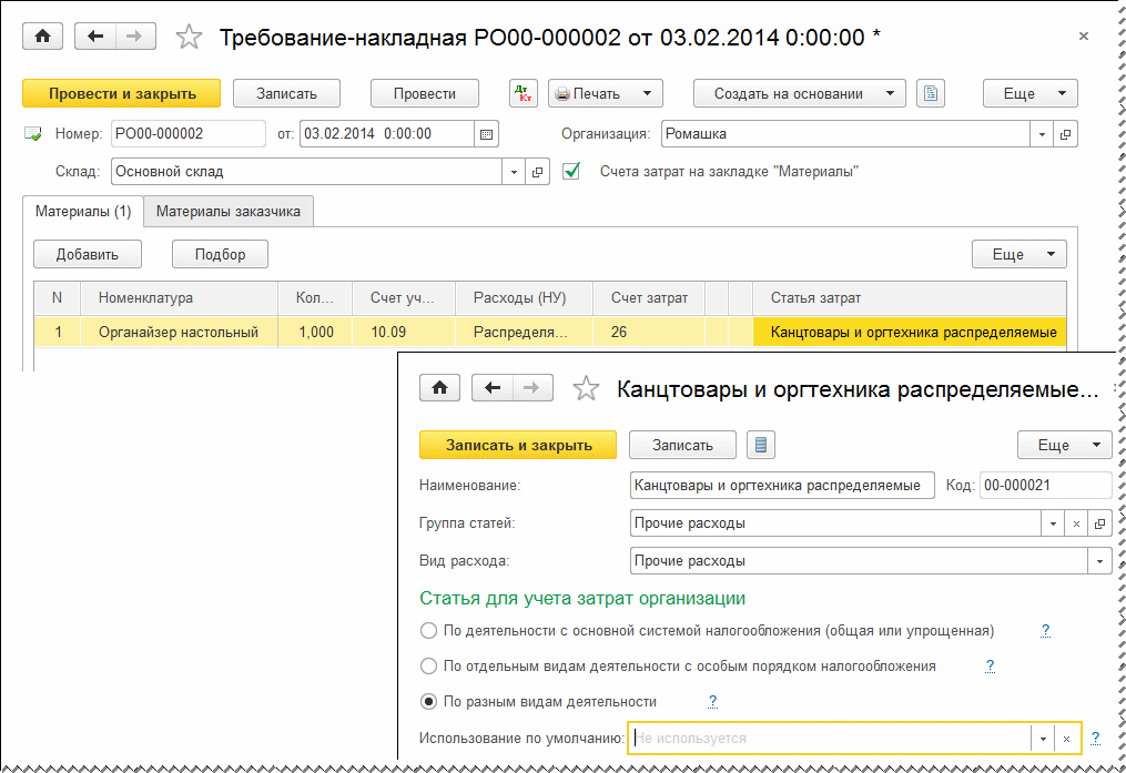 Настройка статей затрат для учета расходов при совмещении режимов