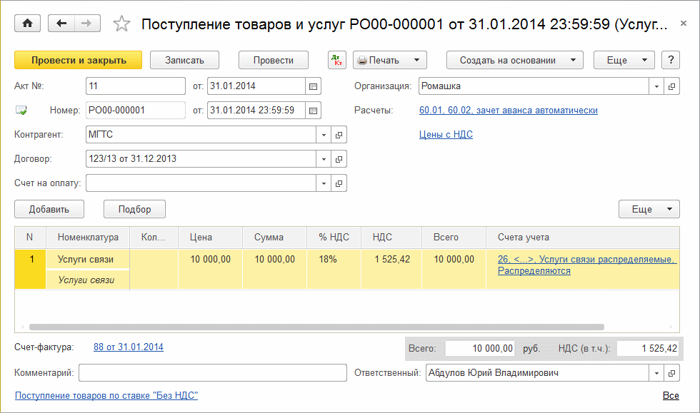Чтобы в документе Поступление товаров и услуг