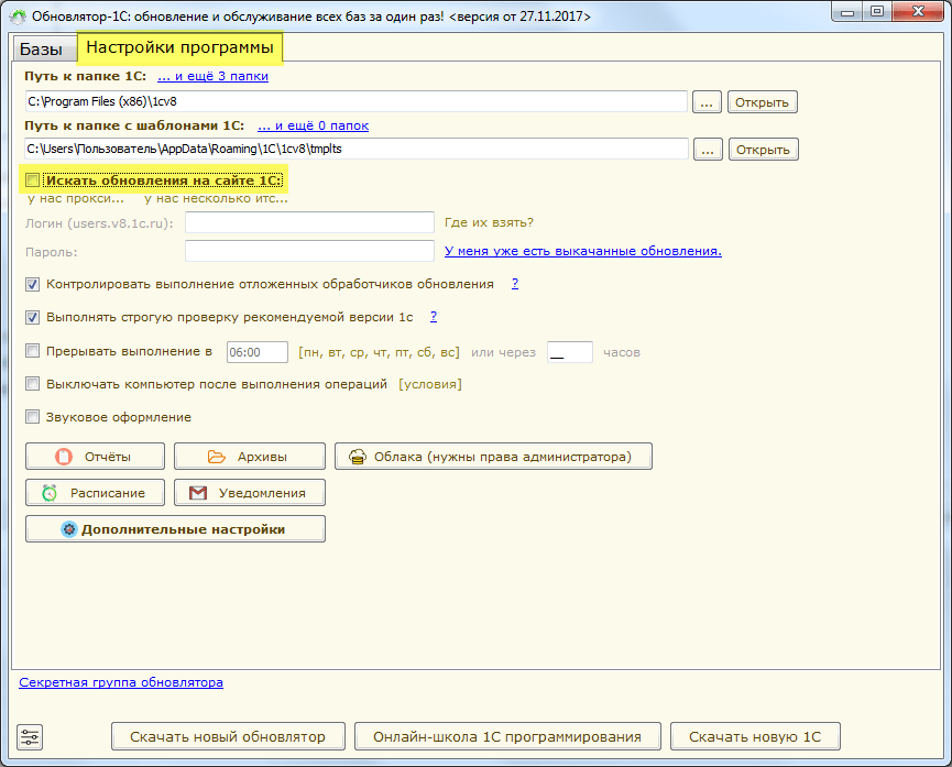 1. Запустите обновлятор и откройте папку с шаблонами 1С на закладке «Настройки программы»: