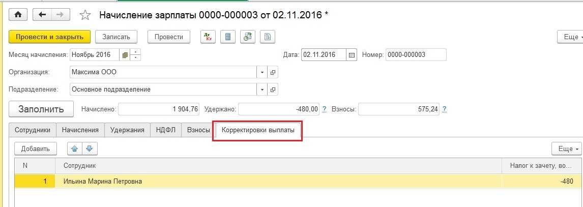 Так как общая сумма переплаты превысила сумму налога за ноябрь (936-364*3=156), разница отражается на вкладке Корректировка выплаты.