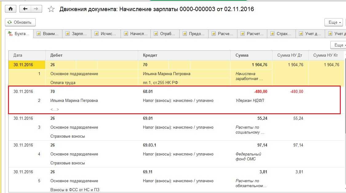 - Найдите строку с удержанием НДФЛ и выделите ее.
