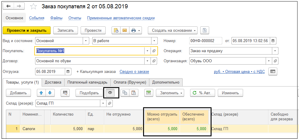 Документы «Заказ покупателя» и «Расходная накладная» отражают количество товара, которое есть на складах и которое можно отгрузить заказчик. Также можно видеть товар, который зарезервирован и ожидается к поступлению на склад.