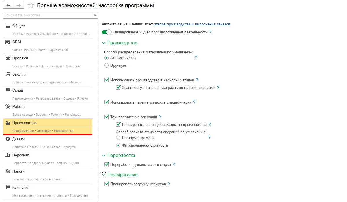 Дополнительно в производственной системе есть настройка вариантов распределения материалов: автоматически по спецификациям либо вручную по факту.