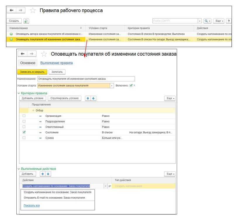 Раздел «CRM-Правила рабочего процесса» оповестит о состоянии заказов. Покупатель получит SMS-уведомление или электронное письмо, а менеджеру придет соответствующее задание.