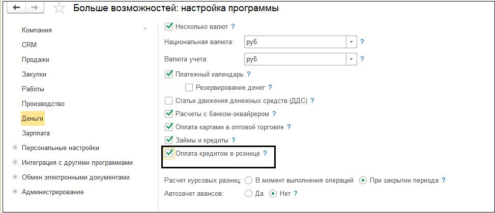 В УНФ есть функция, которая дает возможность продавать в кредит. Для этого нужно зайти в раздел «Деньги» и отметить флажком «Оплата кредитом в рознице».
