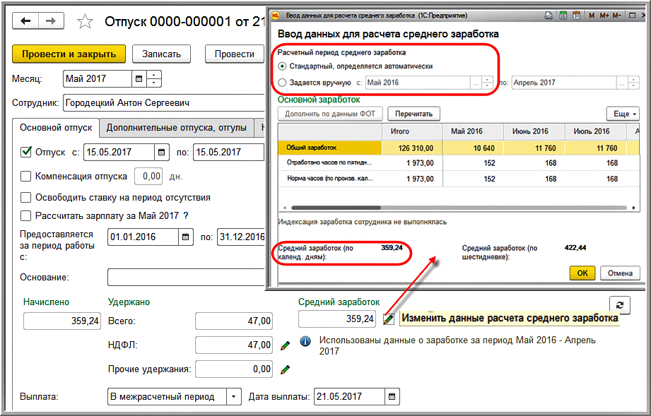 При нажатии на нее открывается окно Ввод данных для расчета среднего заработка. Переключатель Расчетный период среднего заработка предоставляет возможность выбора периода: Стандартный, определяется автоматически и Задается вручную.