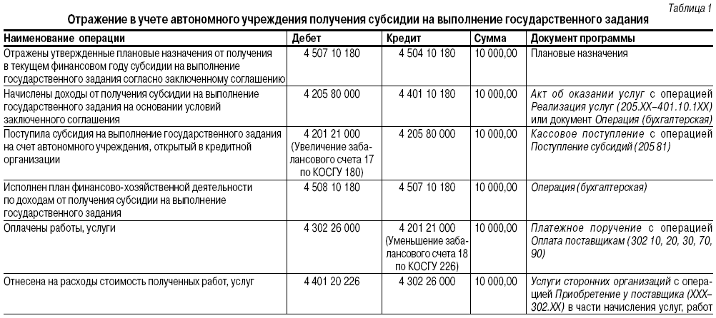 Бухгалтерские записи по получению субсидии на выполнение государственного задания автономного учреждения, а также порядок их отражения в программе «1С:Бухгалтерия государственного учреждения 8» (с указанием документов программы) представлены в таблице 1.