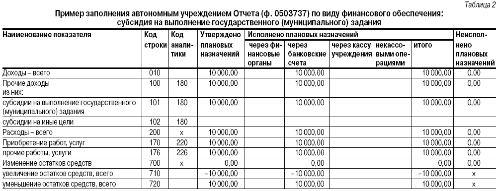Отчет (ф. 0503737) автономного учреждения по виду финансового обеспечения — субсидия на выполнение государственного (муниципального) задания — представлен в таблице 2 (строки с «нулевыми» показателями в таблицы 2, 3, 6, 7 не включены).