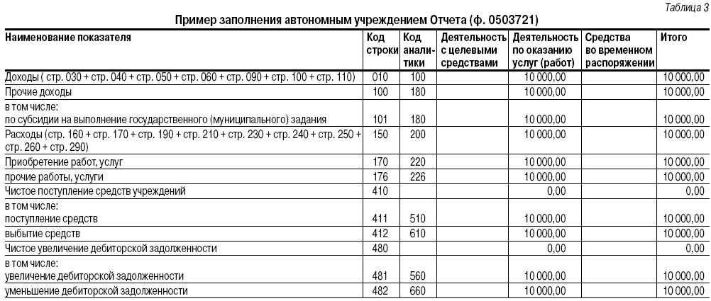 Учитывая, что субсидия на выполнение государственного задания использована автономным учреждением в полном объеме, Баланс государственного (муниципального) учреждения (ф. 0503730) (далее — Баланс (ф. 0503730)) будет «нулевым», поэтому приведем пример заполнения только Отчета о финансовых результатах деятельности учреждения (ф. 0503721) (далее — Отчет (ф. 0503721)) — см. таблицу 3.