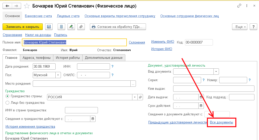 Открыв карточку физического лица нажимаем на «Все документы» и откроется окно со списком документов, которые относятся к данному физическому лицу.