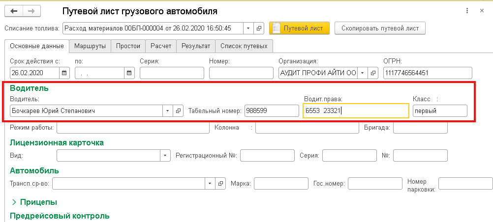 Сохраняем информацию и теперь при выборе водителя в путевом листе автоматичекси будет заполнена информация о его водительских правах.