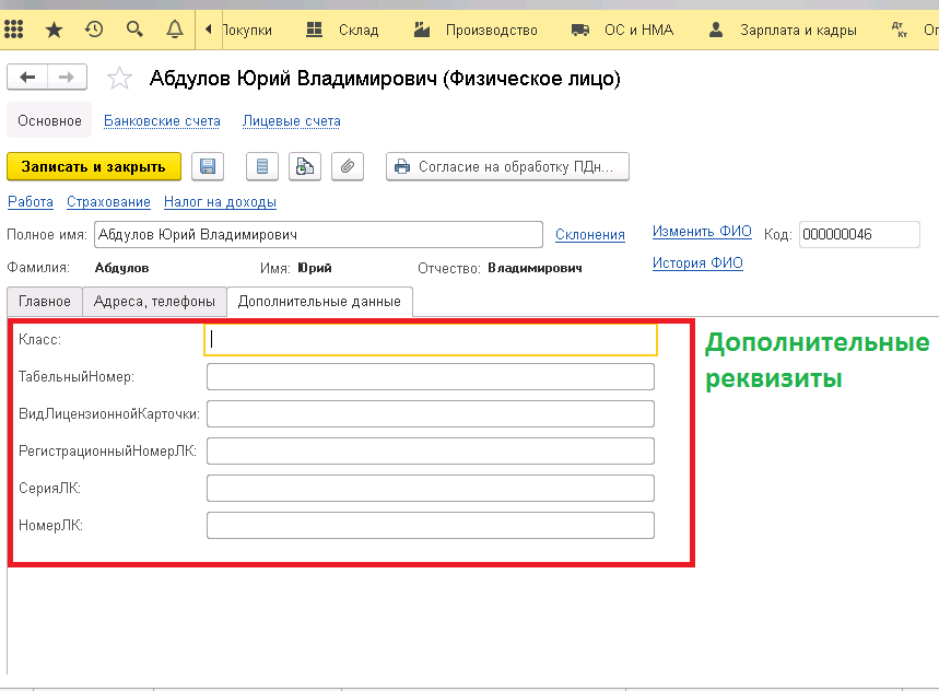 Для автоматического заполнения других сведений о водителе, которые отмечены ранее в скриншоте, необходимо в карточке физического лица перейти на вкладку «Дополнительные данные» и заполнить реквизиты, которые показаны на следующем рисунке.